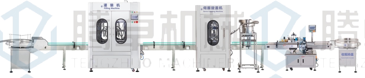 1.全自動(dòng)生產(chǎn)線流程:人工把瓶放到送瓶轉(zhuǎn)盤(pán)上-自動(dòng)灌裝-自動(dòng)理蓋下蓋-自動(dòng)旋蓋-自動(dòng)打碼-自動(dòng)貼標(biāo)-人工收瓶